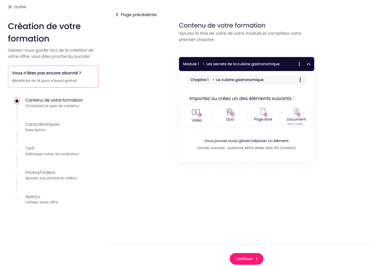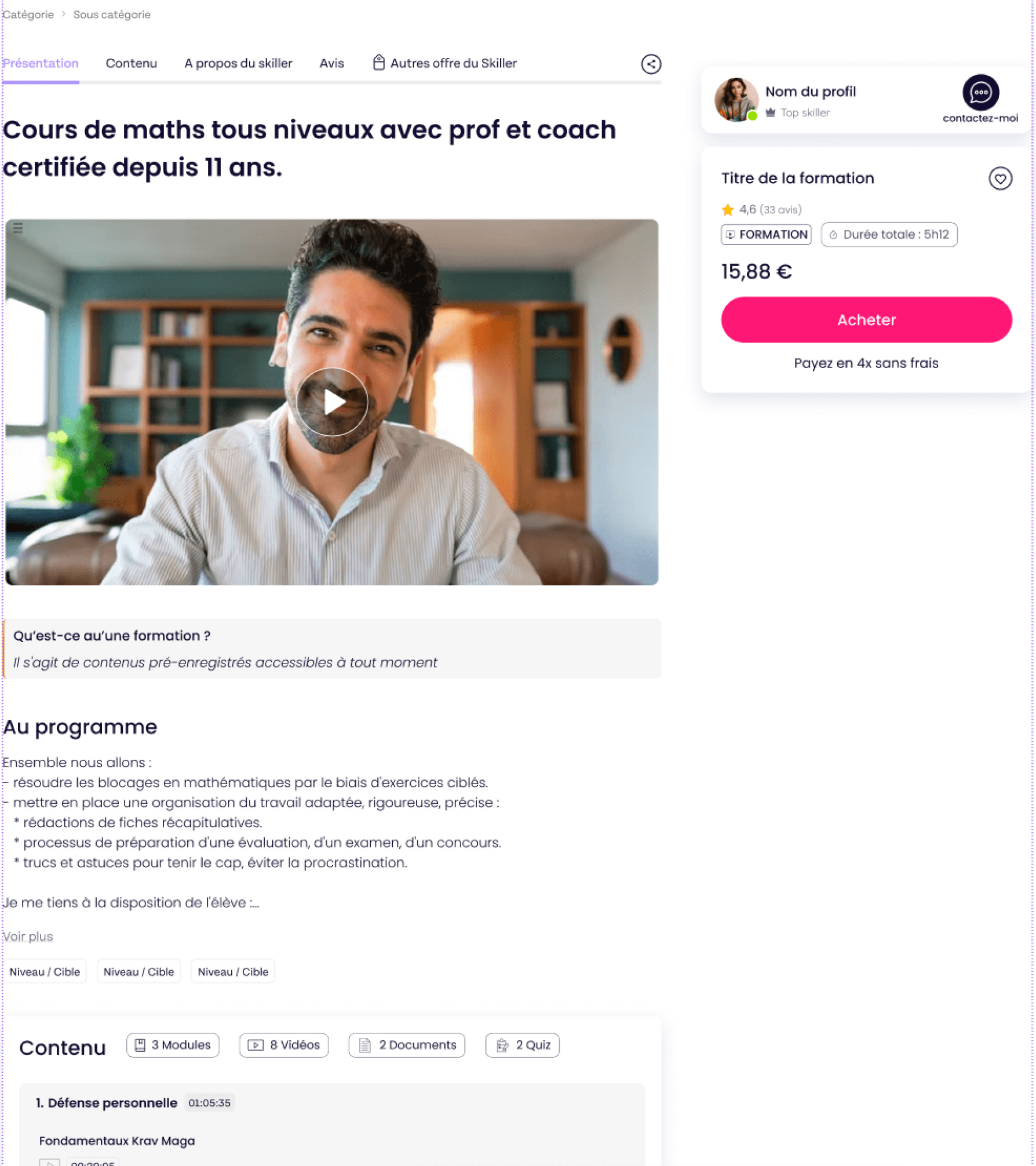 Se divise en modules et en chapitres, le Skiller peut ajouter des vidéos, des quiz, créer une page libre ou des documents.