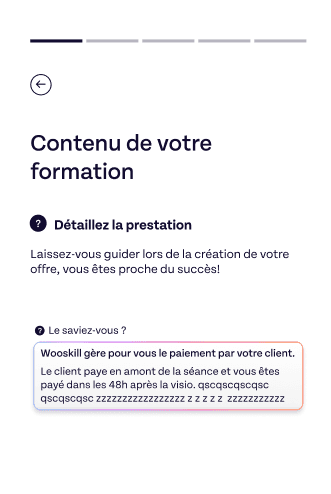 Nous devions faire comprendre aux utilisateurs que les offres sur ce format allaient être disponibles en ligne mais pas en direct, contrairement aux visios, le tout sans tomber dans le côté présentiel qui n'est pas proposé pas Wooskill.