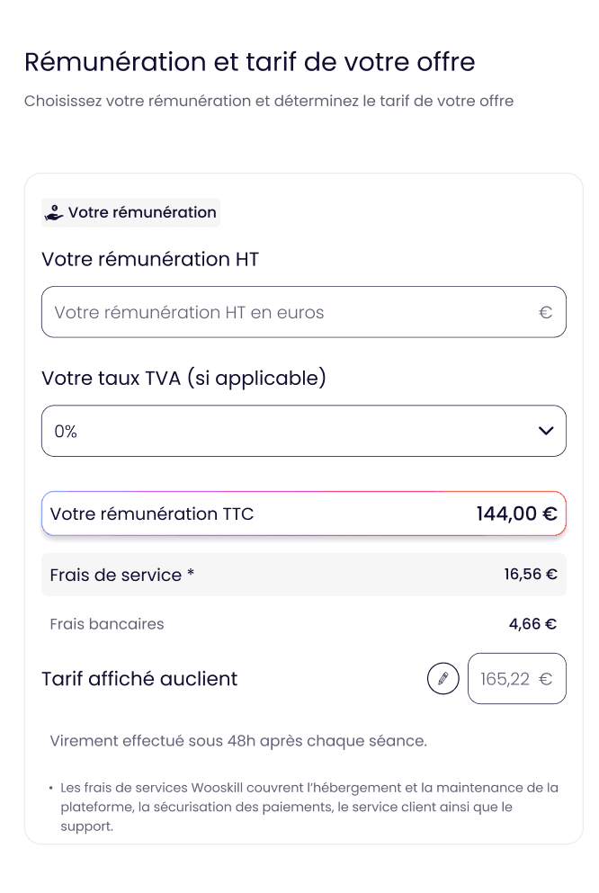 Le Skiller peut définir son prix en fonction de la rémunération qu’il souhaite toucher ou selon le prix qu’il veut proposer au client, et ainsi proposer des prix attrayants.
